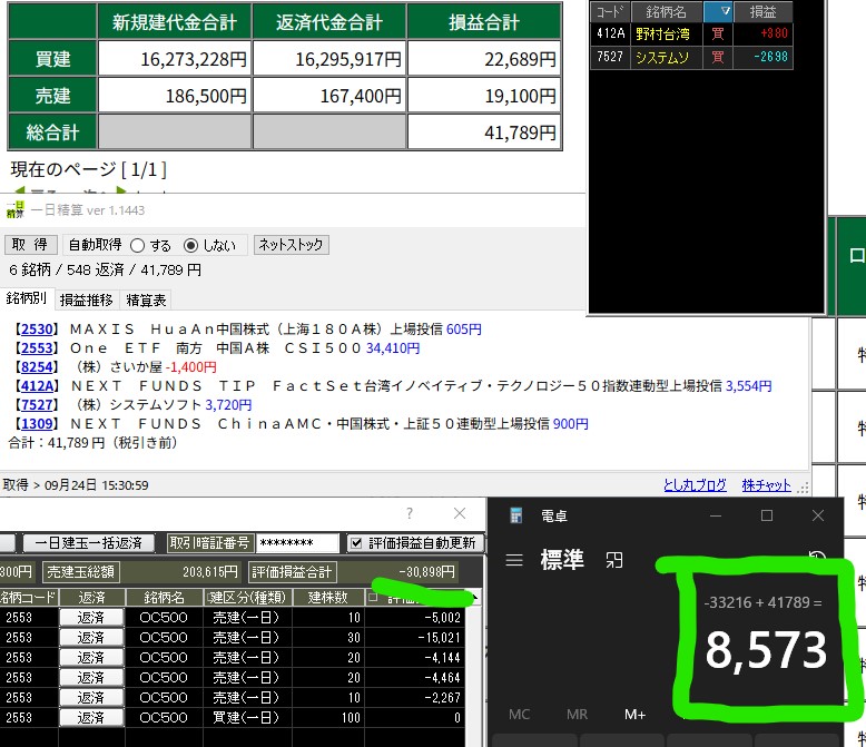 ポチッと応援して頂けたら嬉しいです HOME > トレード結果 > トレード結果 日々の成績 2025/09/24 2025年9月24日 今日は中国のやつ色々触ったけど激しすぎたw 特売りガッツリ食らって全然残らなかった・・・😢 オマケはナシで両方松井と両建て分です 両建てのままS高で現引現渡します 本日+8500でした ポチッと応援して頂けたら嬉しいです ※お知らせ フィスコさんからオファーを頂いて、自分のトレード動画を見てみたいと言ってくれる方も多数いたのでチャレンジしてみました 普段のトレードをそのまま見せています スキャルピング目線の人はもちろん時間軸が違う方にもインアウトのタイミングや考え方は参考になると思っています 板読みについて丁寧に説明したつもりなのでよけばお願いします! 気になる事があればDMなどで連絡下さい 板読みデイトレ術 東京メトロ TwitterTwitter LINE コピーする -トレード結果, 日々の成績