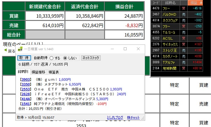 ポチッと応援して頂けたら嬉しいです HOME > トレード結果 > トレード結果 日々の成績 2025/10/03 2025年10月3日 今日もOneETF中国と 9時~寄り付くまでメタプラPTS あと本日上場のオーバーラップ 後場はほぼノートレです オマケは色々やって+400程 フリーの損失がでかすぎた 夢見つけ100株S安捕まって前引け前に現引きして成行出しといたら売れてました これがマイナス200 オマケはチャラって事で! 本日 +16000でした 皆さん今週もお疲れ様でした! 良い週末を🍻🍻 ポチッと応援して頂けたら嬉しいです ※お知らせ フィスコさんからオファーを頂いて、自分のトレード動画を見てみたいと言ってくれる方も多数いたのでチャレンジしてみました 普段のトレードをそのまま見せています スキャルピング目線の人はもちろん時間軸が違う方にもインアウトのタイミングや考え方は参考になると思っています 板読みについて丁寧に説明したつもりなのでよけばお願いします! 気になる事があればDMなどで連絡下さい 板読みデイトレ術 東京メトロ TwitterTwitter LINE コピーする -トレード結果, 日々の成績