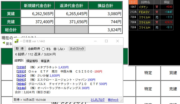 ポチッと応援して頂けたら嬉しいです HOME > トレード結果 > トレード結果 日々の成績 2025/10/06 2025年10月6日 ご祝儀相場に何も出来ず 10時までも全然出来て無くそれ以降はほぼノートレで終了 辛すぎる!w オマケは前引けのスマイル拾えて+1400 クロオクでフィットイージーもガチコン決まるかと思ったけどダメでした 本日 +3800でした ポチッと応援して頂けたら嬉しいです ※お知らせ フィスコさんからオファーを頂いて、自分のトレード動画を見てみたいと言ってくれる方も多数いたのでチャレンジしてみました 普段のトレードをそのまま見せています スキャルピング目線の人はもちろん時間軸が違う方にもインアウトのタイミングや考え方は参考になると思っています 板読みについて丁寧に説明したつもりなのでよけばお願いします! 気になる事があればDMなどで連絡下さい 板読みデイトレ術 東京メトロ TwitterTwitter LINE コピーする -トレード結果, 日々の成績