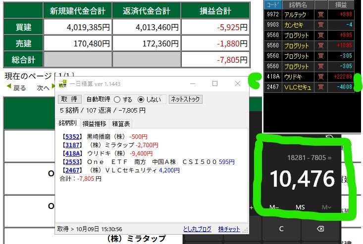 ポチッと応援して頂けたら嬉しいです HOME > トレード結果 > トレード結果 日々の成績 2025/10/09 2025年10月9日 今日は昨日S高のウリドキとVLCカブコムと両建て ウリドキはビビりすぎて全然入れなかった VLCはデーセクみながらやったら全然噛み合わなくチャラ オマケは+2400 下2つウリドキとVLCセキュは松井と両建て分です ウリドキ+13000程 VLCチャラ 本日➕️10400でした ミラタップ許せねえ...w ポチッと応援して頂けたら嬉しいです ※お知らせ フィスコさんからオファーを頂いて、自分のトレード動画を見てみたいと言ってくれる方も多数いたのでチャレンジしてみました 普段のトレードをそのまま見せています スキャルピング目線の人はもちろん時間軸が違う方にもインアウトのタイミングや考え方は参考になると思っています 板読みについて丁寧に説明したつもりなのでよけばお願いします! 気になる事があればDMなどで連絡下さい 板読みデイトレ術 東京メトロ TwitterTwitter LINE コピーする -トレード結果, 日々の成績