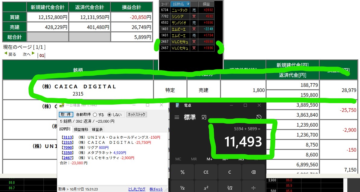 ポチッと応援して頂けたら嬉しいです HOME > トレード結果 > トレード結果 日々の成績 2025/10/17 2025年10月17日 今日はCAICAとメタプラ 両方小銭拾いのみ デーセクが謎の上げでちょっとだけVLC オマケは+3300程 VLCは松井と両建て分です CAICAが半年売りなので1日精算表に反映されてません CAICA+3200 VLC+2600 本日➕️11400でした みなさん今週もお疲れ様でした! 良い週末を🍻🍻 ポチッと応援して頂けたら嬉しいです ※お知らせ フィスコさんからオファーを頂いて、自分のトレード動画を見てみたいと言ってくれる方も多数いたのでチャレンジしてみました 普段のトレードをそのまま見せています スキャルピング目線の人はもちろん時間軸が違う方にもインアウトのタイミングや考え方は参考になると思っています 板読みについて丁寧に説明したつもりなのでよけばお願いします! 気になる事があればDMなどで連絡下さい 板読みデイトレ術 東京メトロ TwitterTwitter LINE コピーする -トレード結果, 日々の成績