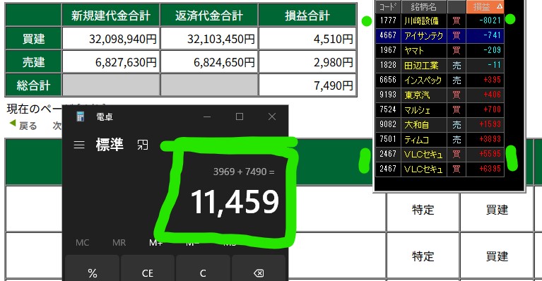 ポチッと応援して頂けたら嬉しいです HOME > トレード結果 > トレード結果 日々の成績 2025/11/04 2025年11月4日 今日は名証川崎設備 あと途中からVLC 今日も小銭集めのみでした VLCは気がつくの遅れてちょっともったいなかったと思う オマケはティムコが決まって+6000程 一番上の川崎設備と 一番下2つVLCは松井と両建て分です 大黒屋半年売りで1日精算に反映されてないので銘柄カットしました 本日➕️11400でした ポチッと応援して頂けたら嬉しいです ※お知らせ フィスコさんからオファーを頂いて、自分のトレード動画を見てみたいと言ってくれる方も多数いたのでチャレンジしてみました 普段のトレードをそのまま見せています スキャルピング目線の人はもちろん時間軸が違う方にもインアウトのタイミングや考え方は参考になると思っています 板読みについて丁寧に説明したつもりなのでよけばお願いします! 気になる事があればDMなどで連絡下さい 板読みデイトレ術 東京メトロ TwitterTwitter LINE コピーする -トレード結果, 日々の成績