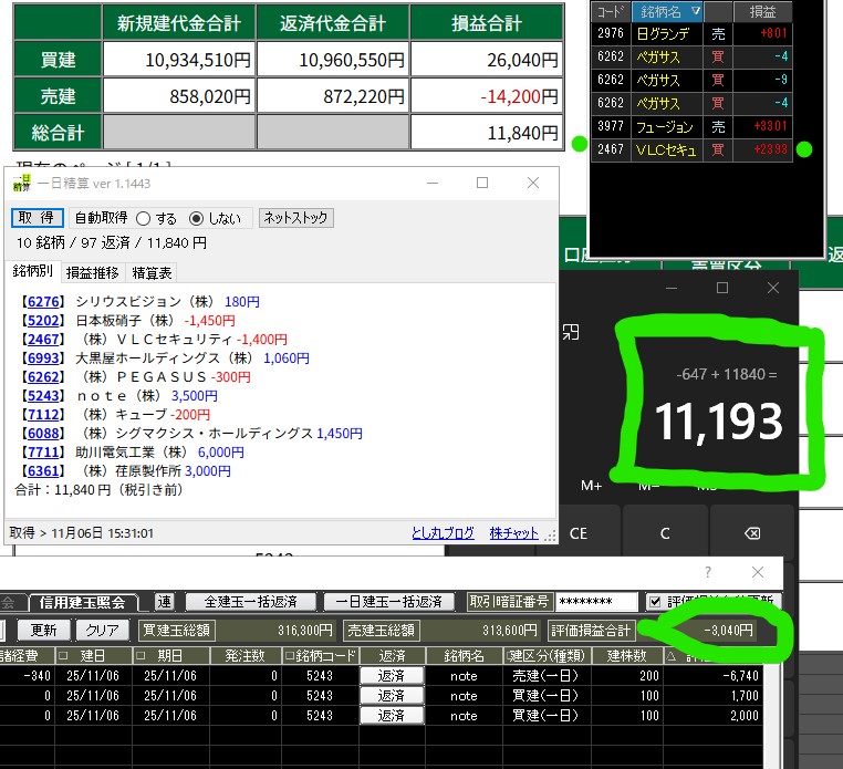 ポチッと応援して頂けたら嬉しいです HOME > トレード結果 > トレード結果 日々の成績 2025/11/06 2025年11月6日 今日も色々小銭集め 全然なんもやれず 最後助川S安付近スキャ、もうちょい上手くやれればなあ オマケは札証の現物のみフュージョンと日グランデ フュージョンは昨日の大引け、何故か切れて無くてラッキーパンチ+4100 一番したのVLCは松井と両建て分です あとnote両建てのままS高いっちゃったので現引き現渡します含み損-3000 VLC+1000 note+500 以下は1日精算表の通りです 本日➕️11100でした ポチッと応援して頂けたら嬉しいです ※お知らせ フィスコさんからオファーを頂いて、自分のトレード動画を見てみたいと言ってくれる方も多数いたのでチャレンジしてみました 普段のトレードをそのまま見せています スキャルピング目線の人はもちろん時間軸が違う方にもインアウトのタイミングや考え方は参考になると思っています 板読みについて丁寧に説明したつもりなのでよけばお願いします! 気になる事があればDMなどで連絡下さい 板読みデイトレ術 ⇓今やメインの手法 東京メトロ TwitterTwitter LINE コピーする -トレード結果, 日々の成績
