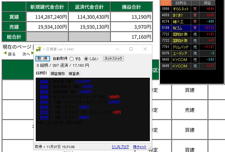 ポチッと応援して頂けたら嬉しいです HOME > トレード結果 > トレード結果 日々の成績 2025/11/07 2025年11月7日 今日もひたすら小銭集めのみ S安付近メイン オマケはクロオク色々入って+4500程 1日精算表ぶっ壊れたの今日は数字のみでw 本日➕️17100でした 皆さん今週もお疲れ様でした 良い週末を🍻🍻 ポチッと応援して頂けたら嬉しいです ※お知らせ フィスコさんからオファーを頂いて、自分のトレード動画を見てみたいと言ってくれる方も多数いたのでチャレンジしてみました 普段のトレードをそのまま見せています スキャルピング目線の人はもちろん時間軸が違う方にもインアウトのタイミングや考え方は参考になると思っています 板読みについて丁寧に説明したつもりなのでよけばお願いします! 気になる事があればDMなどで連絡下さい 板読みデイトレ術 東京メトロ TwitterTwitter LINE コピーする -トレード結果, 日々の成績