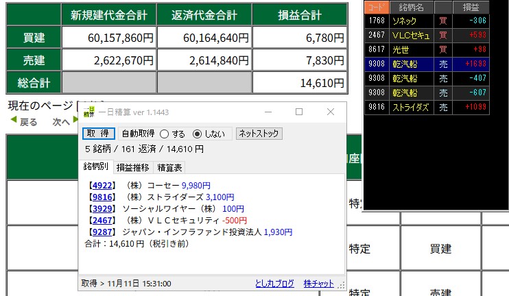 ポチッと応援して頂けたら嬉しいです HOME > トレード結果 > トレード結果 日々の成績 2025/11/11 2025年11月11日 昨日の比例当たったトレードワークスPTSやろうと思ってたのに すっかり忘れてて今日の寄付きで+4800 今日もなんも見当たらずに小銭集め VLC寄付きの気配見て一応建てたけど動かず カブコム+2100 プチ勝負の乾汽船がバッコシ決まったと思ったけど不発 比例合わせてオマケは+6900 VLC両建てだけどワンティックなのでそのままで 本日➕️14600でした ユニチカ比例で100買えたみたいだけど...どうだろ? ポチッと応援して頂けたら嬉しいです ※お知らせ フィスコさんからオファーを頂いて、自分のトレード動画を見てみたいと言ってくれる方も多数いたのでチャレンジしてみました 普段のトレードをそのまま見せています スキャルピング目線の人はもちろん時間軸が違う方にもインアウトのタイミングや考え方は参考になると思っています 板読みについて丁寧に説明したつもりなのでよけばお願いします! 気になる事があればDMなどで連絡下さい 板読みデイトレ術 東京メトロ TwitterTwitter LINE コピーする -トレード結果, 日々の成績
