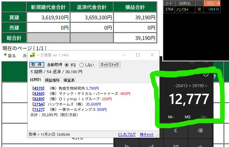 ポチッと応援して頂けたら嬉しいです HOME > トレード結果 > トレード結果 日々の成績 2025/11/21 2025年11月21日 これから富山へ行くので今日は前場のみで カブコムでハンワ今日から売りあったので両建て 朝の下げからの上げで噛み合わず行って来い その後小銭何回か拾って手仕舞いしました オマケはナシ ハンワは松井と両建て分です ハンワ+9000 以下1日精算表の通りです 本日➕️12700でした 皆さん良い連休を🍻🍻🍻 ポチッと応援して頂けたら嬉しいです ※お知らせ フィスコさんからオファーを頂いて、自分のトレード動画を見てみたいと言ってくれる方も多数いたのでチャレンジしてみました 普段のトレードをそのまま見せています スキャルピング目線の人はもちろん時間軸が違う方にもインアウトのタイミングや考え方は参考になると思っています 板読みについて丁寧に説明したつもりなのでよけばお願いします! 気になる事があればDMなどで連絡下さい 板読みデイトレ術 東京メトロ TwitterTwitter LINE コピーする -トレード結果, 日々の成績