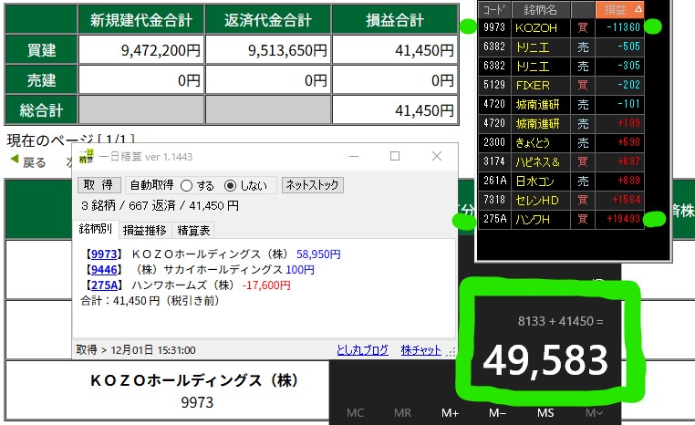 ポチッと応援して頂けたら嬉しいです HOME > トレード結果 > トレード結果 日々の成績 2025/12/01 2025年12月1日 今日もKOZOHD それとハンワ ハンワはほぼ建てただけでなんも出来ず微プラ KOZOはスタートから噛み合って30分で3万! 10時以降はあまり動かずちょっとずつ積んで 大引け前5万超えてたけどクロオクで2000程やられて終了でした カブコム色々入ってオマケは+2800 一番上のKOZOHと一番したのハンワは松井と両建て分です KOZO+47500 ハンワ+1800 本日➕️49500でした! ポチッと応援して頂けたら嬉しいです ※お知らせ フィスコさんからオファーを頂いて、自分のトレード動画を見てみたいと言ってくれる方も多数いたのでチャレンジしてみました 普段のトレードをそのまま見せています スキャルピング目線の人はもちろん時間軸が違う方にもインアウトのタイミングや考え方は参考になると思っています 板読みについて丁寧に説明したつもりなのでよけばお願いします! 気になる事があればDMなどで連絡下さい 板読みデイトレ術 ⇓今やメインの手法 東京メトロ TwitterTwitter LINE コピーする -トレード結果, 日々の成績