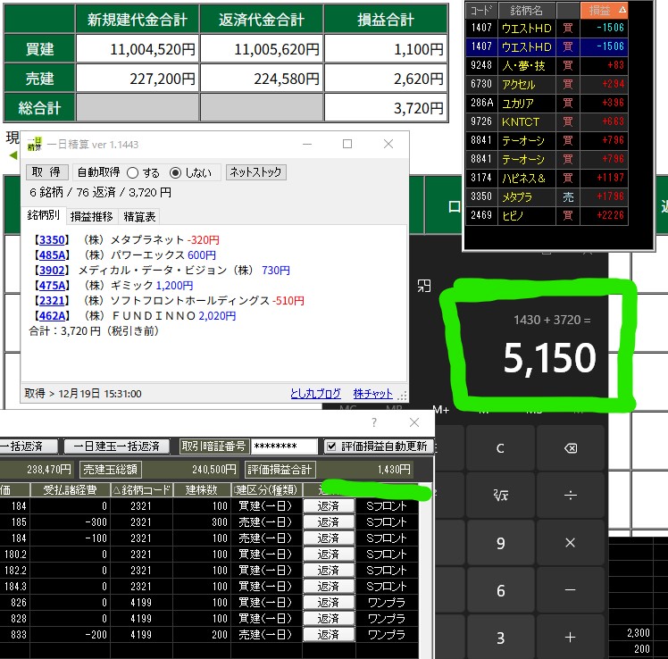 ポチッと応援して頂けたら嬉しいです HOME > トレード結果 > トレード結果 日々の成績 2025/12/19 2025年12月19日 昨日PCが届いて遅くまでいじってて 今日もファンディーノやったけど全然やれませんでした 動きもイマイチだったのでPCと格闘してましたw カブコムはオークション色々はいって+5200 ウエスト早く入りすぎてまぁまぁの損切りに痛い そして松井の両建てポジすっかり忘れてたので現引き現渡しますw 本日➕️5100でした ポチッと応援して頂けたら嬉しいです ※お知らせ フィスコさんからオファーを頂いて、自分のトレード動画を見てみたいと言ってくれる方も多数いたのでチャレンジしてみました 普段のトレードをそのまま見せています スキャルピング目線の人はもちろん時間軸が違う方にもインアウトのタイミングや考え方は参考になると思っています 板読みについて丁寧に説明したつもりなのでよけばお願いします! 気になる事があればDMなどで連絡下さい 板読みデイトレ術 ⇓今やメインの手法 東京メトロ TwitterTwitter LINE コピーする -トレード結果, 日々の成績