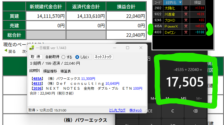 ポチッと応援して頂けたら嬉しいです HOME > トレード結果 > トレード結果 日々の成績 2025/12/23 2025年12月23日 今日はパワーエックスとデフコン カブコムと両建て デフコンは全然噛み合わず✖ パワーエックスはビビりながらコツコツだけど 運よくやられなかっただけな感じがします カブコムはオークションで+2500 比例と合わせてオマケは+7400 下2つPowerXとDefコンは松井と両建て分です パワーエックス+15800 Defコン+1500 本日➕️17500でした ポチッと応援して頂けたら嬉しいです ※お知らせ フィスコさんからオファーを頂いて、自分のトレード動画を見てみたいと言ってくれる方も多数いたのでチャレンジしてみました 普段のトレードをそのまま見せています スキャルピング目線の人はもちろん時間軸が違う方にもインアウトのタイミングや考え方は参考になると思っています 板読みについて丁寧に説明したつもりなのでよけばお願いします! 気になる事があればDMなどで連絡下さい 板読みデイトレ術 ⇓今やメインの手法 東京メトロ TwitterTwitter LINE コピーする -トレード結果, 日々の成績