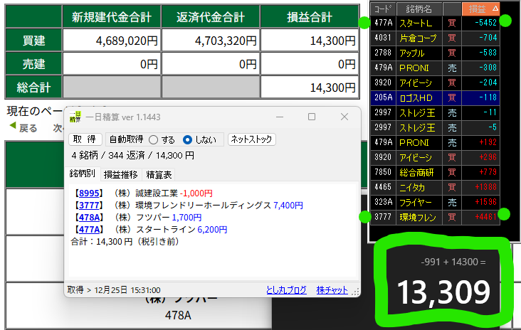 ポチッと応援して頂けたら嬉しいです HOME > トレード結果 > トレード結果 日々の成績 2025/12/25 2025年12月25日 今日は環境フレンドとスタートライン カブコムと両建て パワーエックスもやりたかったけど 売り料11円と動きもエグすぎてスルー スタートラインは全然動かず数回のみ 環境フレンドで小銭集めて終了でした カブコムはオークション色々入って+2300 ロゴス決まると思ったけど不発 一番上のスタートLと一番下の環境フレンは松井と両建て分です 環境フレンド+10600 スタートライン+700 本日➕️13300でした ポチッと応援して頂けたら嬉しいです ※お知らせ フィスコさんからオファーを頂いて、自分のトレード動画を見てみたいと言ってくれる方も多数いたのでチャレンジしてみました 普段のトレードをそのまま見せています スキャルピング目線の人はもちろん時間軸が違う方にもインアウトのタイミングや考え方は参考になると思っています 板読みについて丁寧に説明したつもりなのでよけばお願いします! 気になる事があればDMなどで連絡下さい 板読みデイトレ術 ⇓今やメインの手法 東京メトロ TwitterTwitter LINE コピーする -トレード結果, 日々の成績