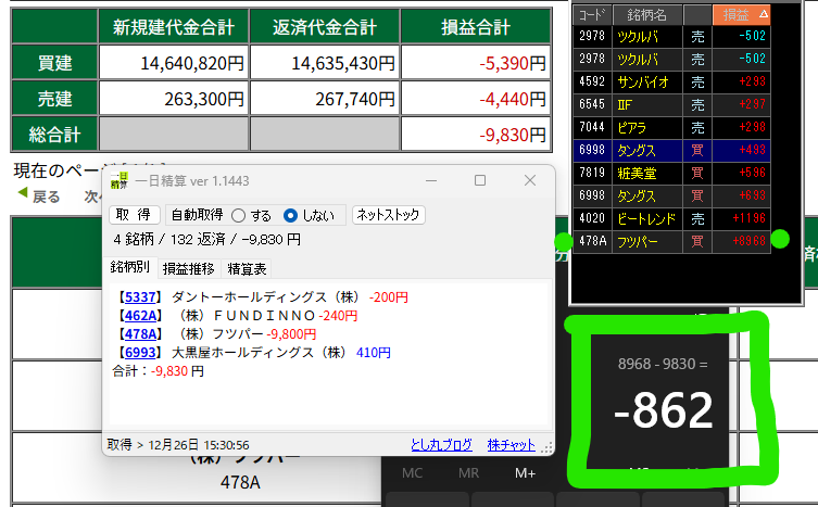 ポチッと応援して頂けたら嬉しいです HOME > トレード結果 > トレード結果 日々の成績 2025/12/26 2025年12月26日 今日はフツパー カブコムと両建て それとファンディーノ お昼から帰省なのに 子供が昨日から熱出して病院やら教室の送りやらでバタバタ 後場ちょことっとやってプラスだったけど大引け間際一発食らってマイ転して終了 カブコムはオークションと後場寄りいくつか入って+2800 一番下のフツパーは松井と両建て分です 本日➖️800でした 良い週末を🍻🍻 ポチッと応援して頂けたら嬉しいです ※お知らせ フィスコさんからオファーを頂いて、自分のトレード動画を見てみたいと言ってくれる方も多数いたのでチャレンジしてみました 普段のトレードをそのまま見せています スキャルピング目線の人はもちろん時間軸が違う方にもインアウトのタイミングや考え方は参考になると思っています 板読みについて丁寧に説明したつもりなのでよけばお願いします! 気になる事があればDMなどで連絡下さい 板読みデイトレ術 ⇓今やメインの手法 東京メトロ TwitterTwitter LINE コピーする -トレード結果, 日々の成績