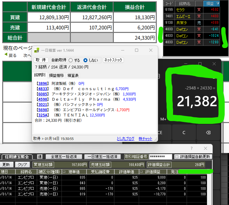 ポチッと応援して頂けたら嬉しいです HOME > トレード結果 > トレード結果 日々の成績 2026/01/14 2026年1月14日 今日は下値4倍のデルタ 途中からDefコン あとテンシャル カブコムはクロオクで+1400 下3つDefコンは松井と両建て分です エンビプロちょこっとやってちょっとやられて放置してたら S高行ってたので現引き現渡します Defコン+3700 松井は本日➕️21300でした ポチッと応援して頂けたら嬉しいです ※お知らせ フィスコさんからオファーを頂いて、自分のトレード動画を見てみたいと言ってくれる方も多数いたのでチャレンジしてみました 普段のトレードをそのまま見せています スキャルピング目線の人はもちろん時間軸が違う方にもインアウトのタイミングや考え方は参考になると思っています 板読みについて丁寧に説明したつもりなのでよけばお願いします! 気になる事があればDMなどで連絡下さい 板読みデイトレ術 ⇓今やメインの手法 東京メトロ TwitterTwitter LINE コピーする -トレード結果, 日々の成績