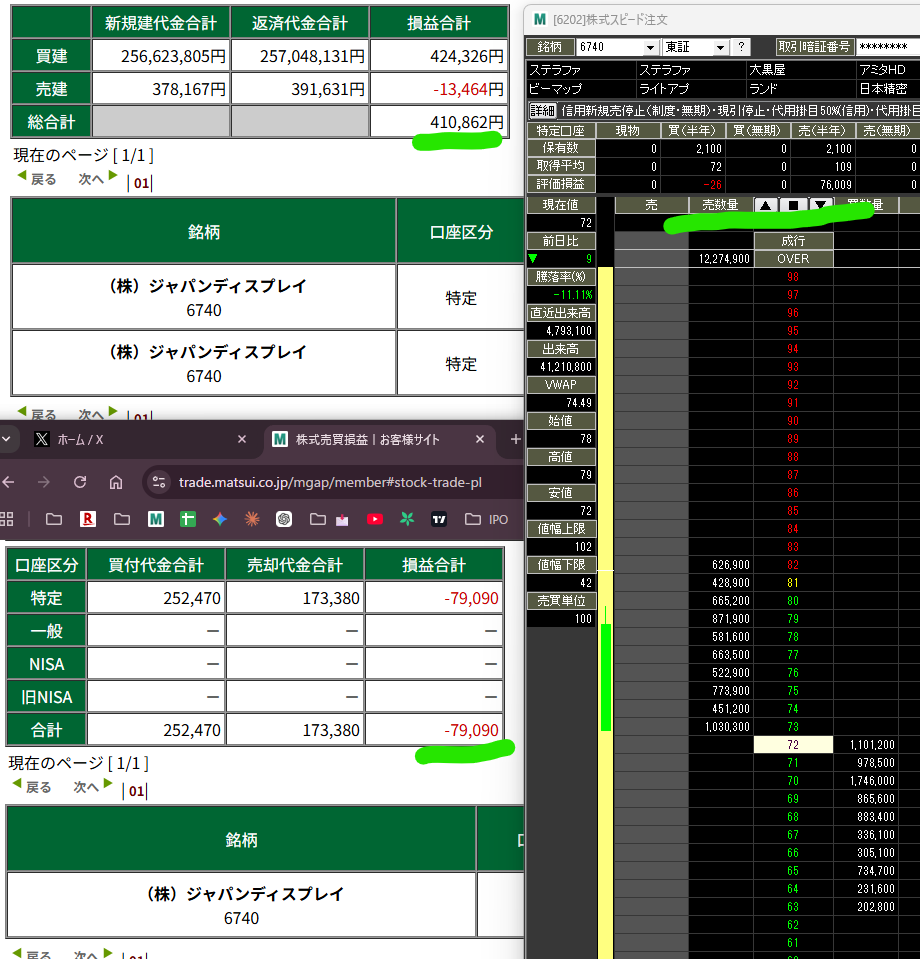 これにさっきのジャパンディスプレイの両建ての含み益が+76000